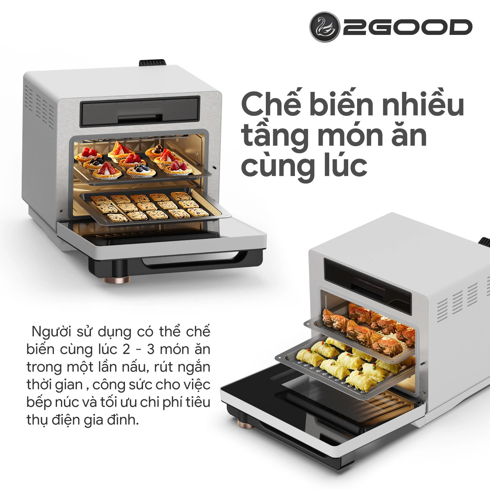 ✅ Dung tích lớn 20 lít, giúp có thể chiên nướng cả 1 con gà, hoặc 2 -3 món ăn cùng 1 lúc nhờ thiết kế 2 tầng để thực phẩm